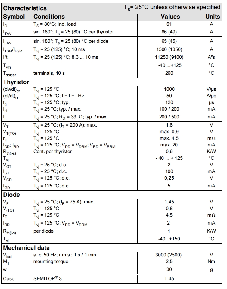 VRSM V | VRRM, V DRM V | ID = 61 A (Ts = 80 ℃) |
